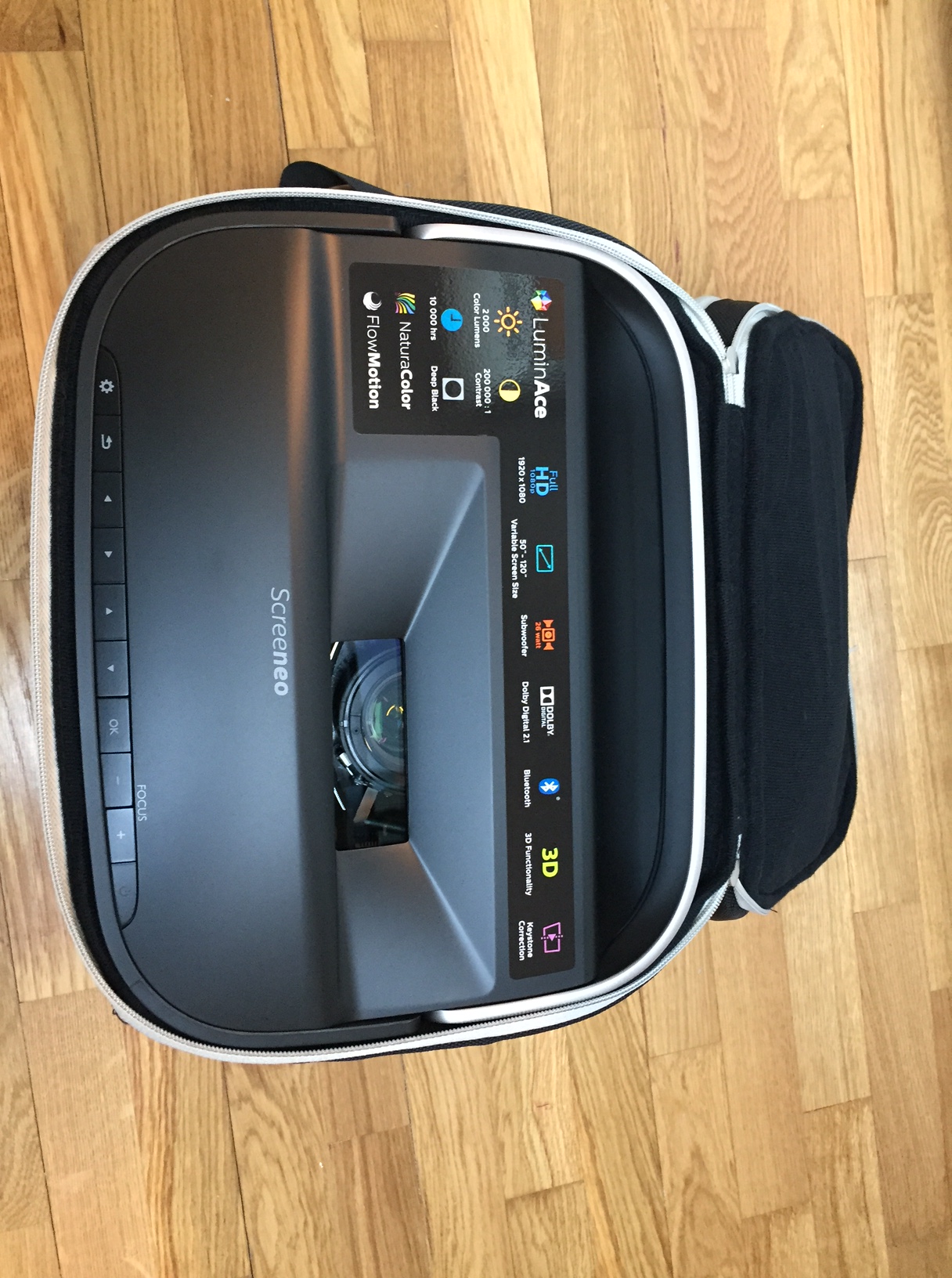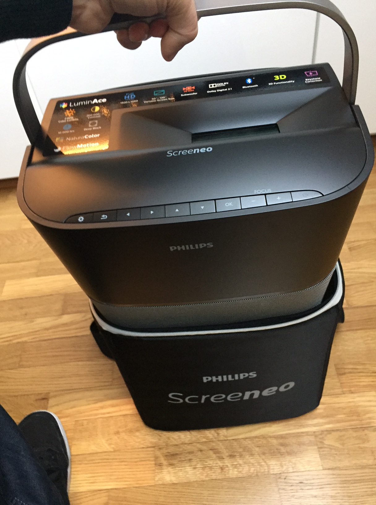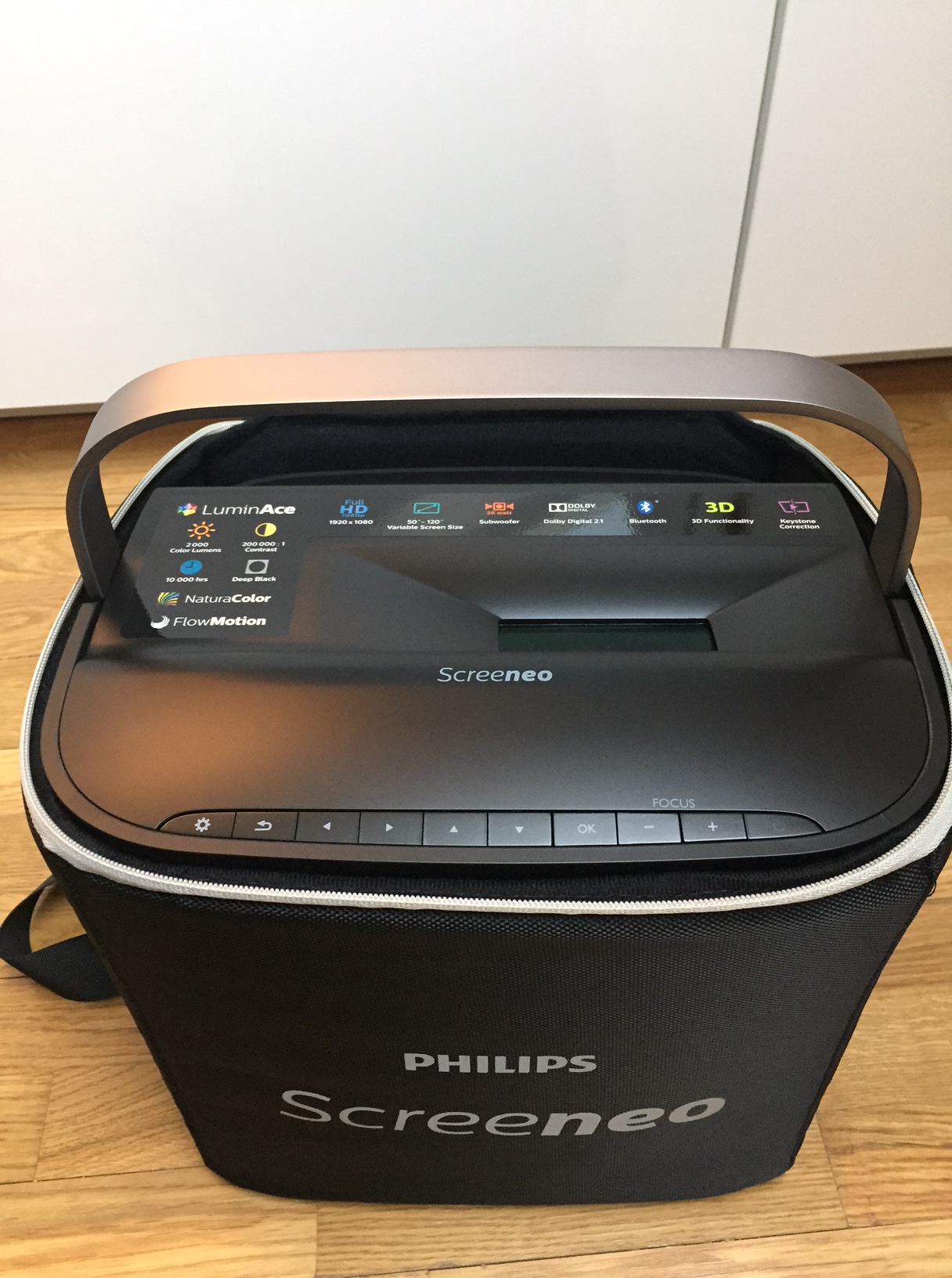 Un projecteur super compact qui peut se transporter facilement grâce à sa poignée et son sac de transport (livré avec).